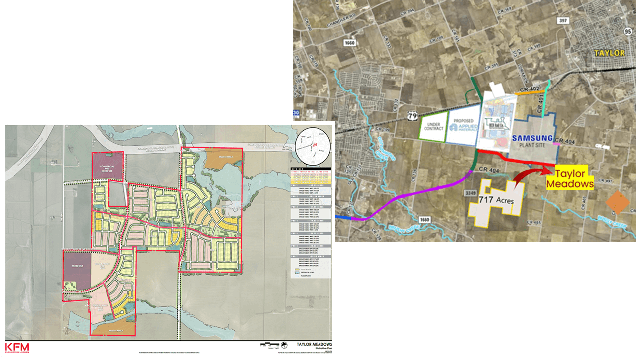 Taylor Meadows is located between Hutto and Taylor, near 3 modern landmarks (new $17B 1200-acre Samsung plant, 750-acre Logistics Park and Hutto Megasite) with excellent access to Tesla Gigafactory and Austin Bergstrom International Airport via 130 and 79.